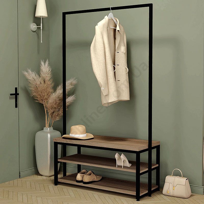 Стійка зі штангою та полицями для взуття у стилі лофт.