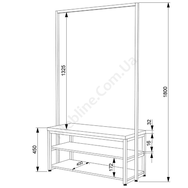 Виконано з ламінованої ДСП Swiss Krono, завтовшки 16 мм.ДСП має високу щільність, екологічна безпека класу Е1.Протиударна кромка ПВХ, завтовшки 0, 5 мм.Корпус — металева труба 25х25 мм, товщина стінок 1, 5 мм.Відкриті полиці для взуття.Штанга для плічок.Підійде для приміщень у стилі лофт.