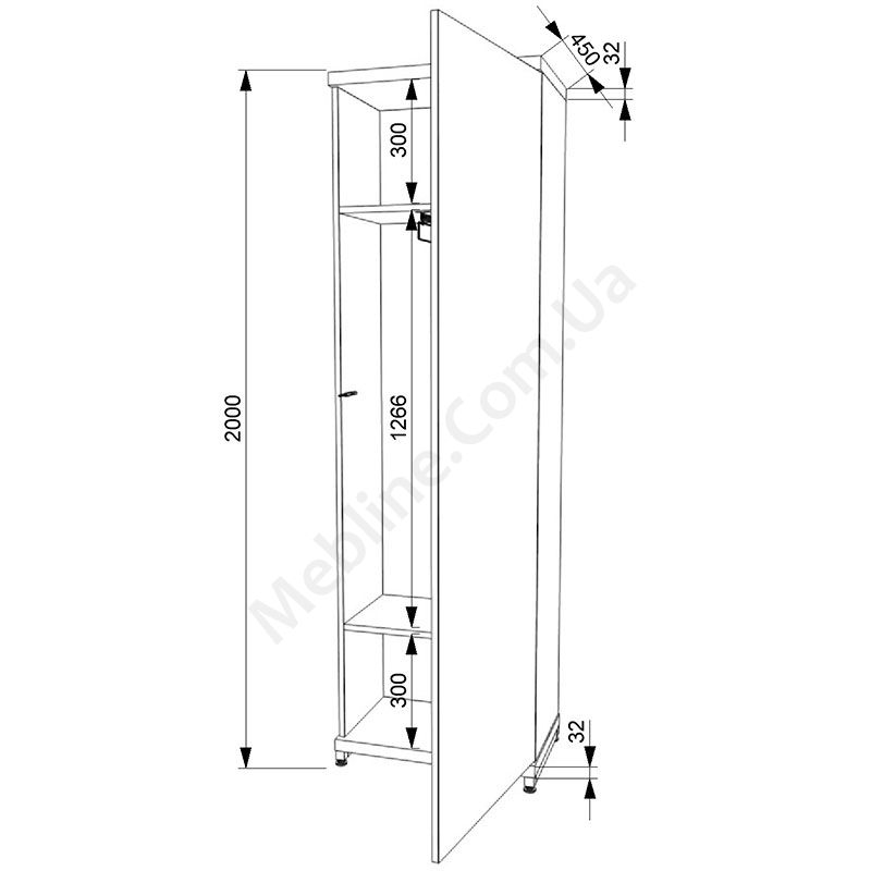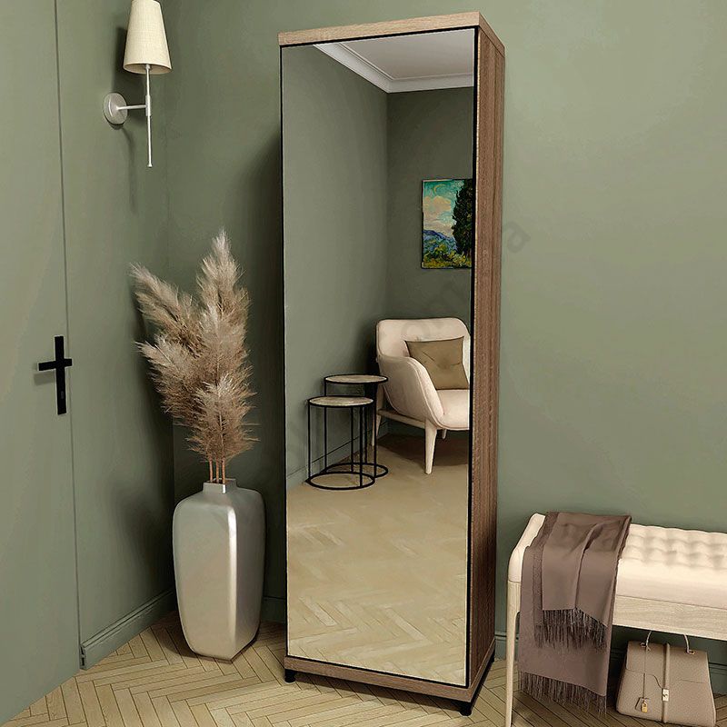Виконаний з ламінованої ДСП Swiss Krono, завтовшки 16 мм.ДСП має високу щільність, екологічна безпека класу Е1.Протиударна кромка ПВХ, завтовшки 0, 5 мм.Опори — металева труба 25х25 мм, товщина стінок 1, 5 мм.Одні дзеркальні розпашні двері.Товщина дзеркала 4 мм.Рама дзеркала з тонкого безохватного профілю.За дверцятами мікроліфт для одягу та дві полиці.Фурнітура DC.Підійде для передпокоїв у стилі лофт.