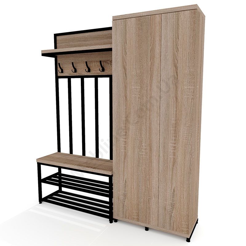 Виконано з ламінованої ДСП Swiss Krono, завтовшки 16 та 32 мм.ДСП має високу щільність, екологічна безпека класу Е1.Протиударна кромка ПВХ, завтовшки 0, 5 та 2 мм.Опори — металева труба 25х25 мм, товщина стінок 1, 5 мм.Чотири металевих гачки для одягу.Відкриті полиці для головних уборів та взуття.Шафа для одягу з двома дверцятами.Усередині шафи мікроліфт для одягу та полиці.Фурнітура DC.Підійде для передпокоїв у стилі лофт.