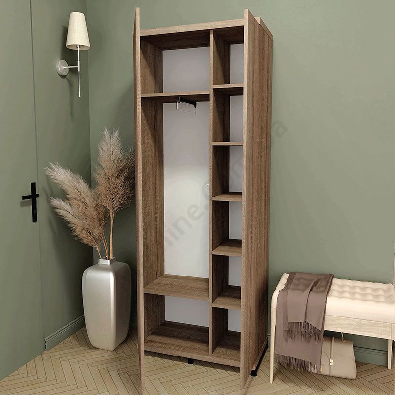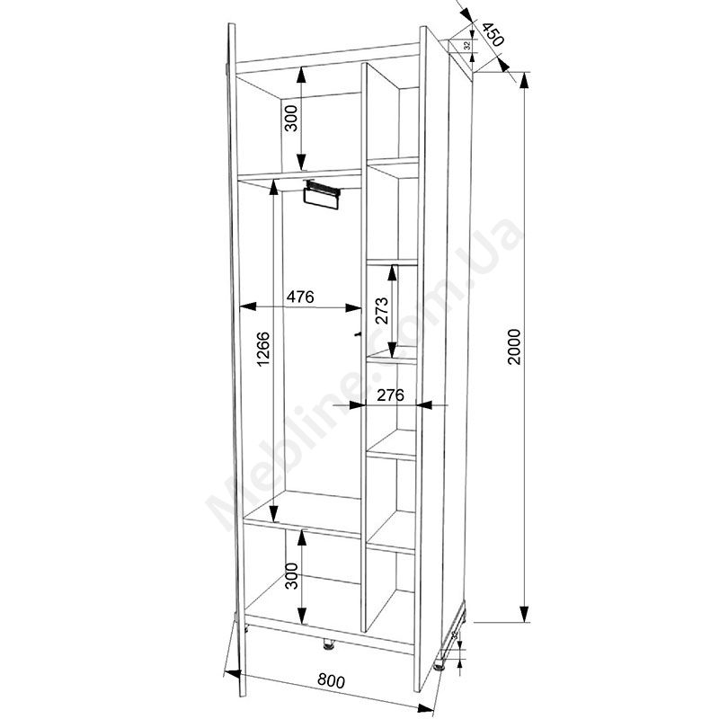 Виконаний з ламінованої ДСП Swiss Krono, завтовшки 16 мм.ДСП має високу щільність, екологічна безпека класу Е1.Протиударна кромка ПВХ, завтовшки 0, 5 мм.Опори — металева труба 25х25 мм, товщина стінок 1, 5 мм.Дві розпашні двері.За дверцятами мікроліфт для одягу та полиці.Фурнітура DC.Підійде для передпокоїв у стилі лофт.