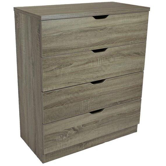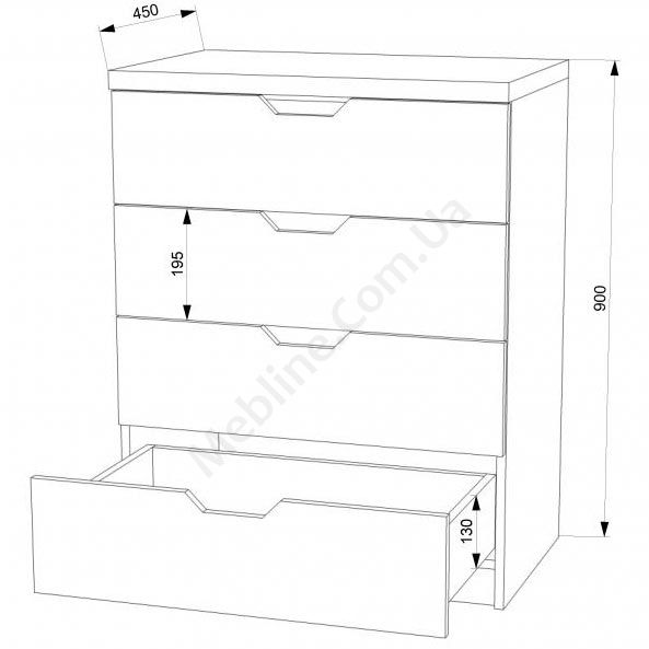 Корпус виконаний з ламінованої ДСП Swiss Krono, завтовшки 16 та 32 мм.ДСП має високу щільність.Екологічна безпека класу Е-1.Кромка — протиударна ПВХ, завтовшки 0, 5 та 2 мм.Фасад виконаний з МДФ.Задня стінка — ДВП.Чотири висувні шухляди.Шухляди на білих роликових напрямних.Замість ручок вирізи у фасаді.