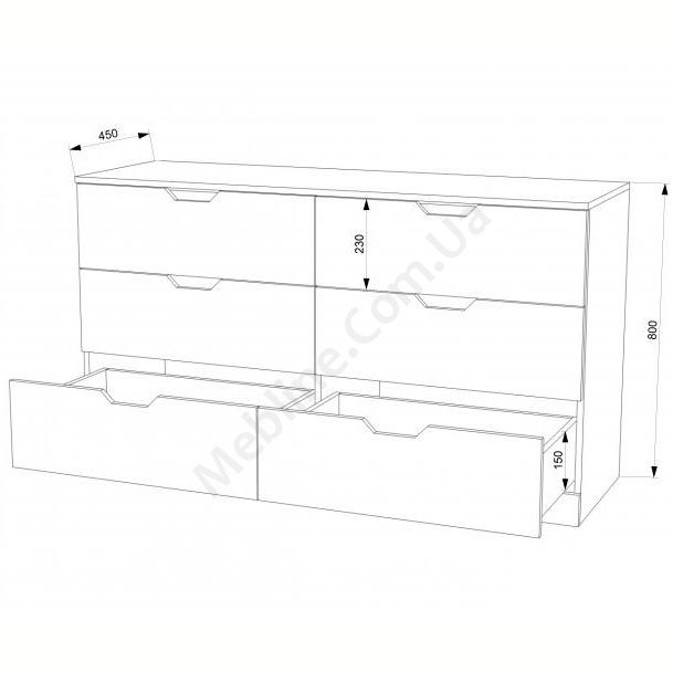 Корпус виконаний з ламінованої ДСП Swiss Krono, завтовшки 16 мм.ДСП має високу щільність.Екологічна безпека класу Е-1.Кромка — протиударна ПВХ, завтовшки 0, 5 та 2 мм.Фасад виконаний з МДФ.Фурнітура — DC та Linken.Задня стінка — ДВП.Шість висувних шухляд.Шухляди на металевих телескопічних напрямних.Замість ручок вирізи у фасаді.