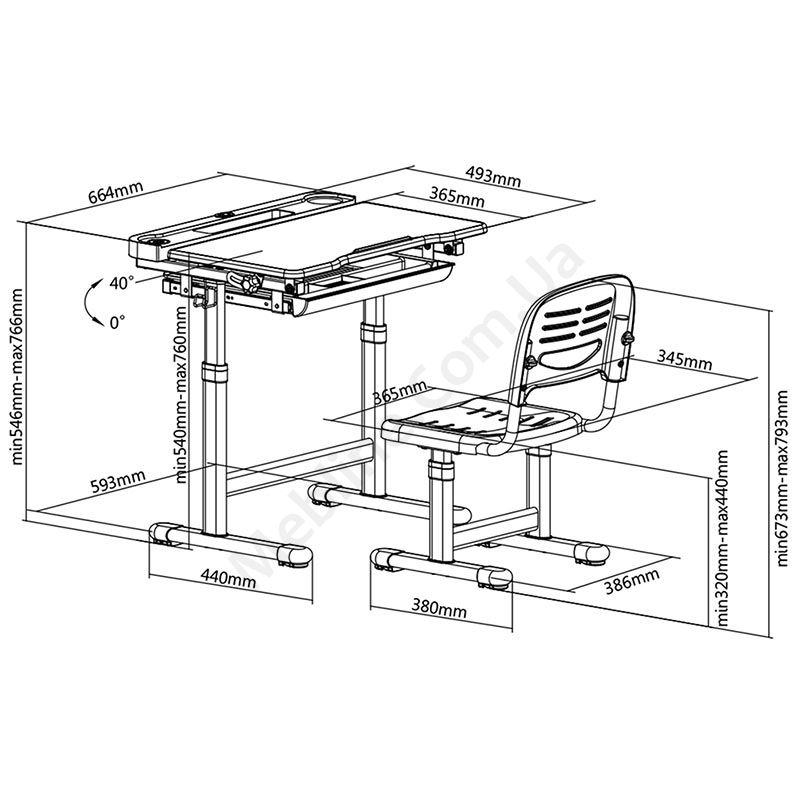 - Кут нахилу стільниці 0-40 градусів (механізм — кнопка).