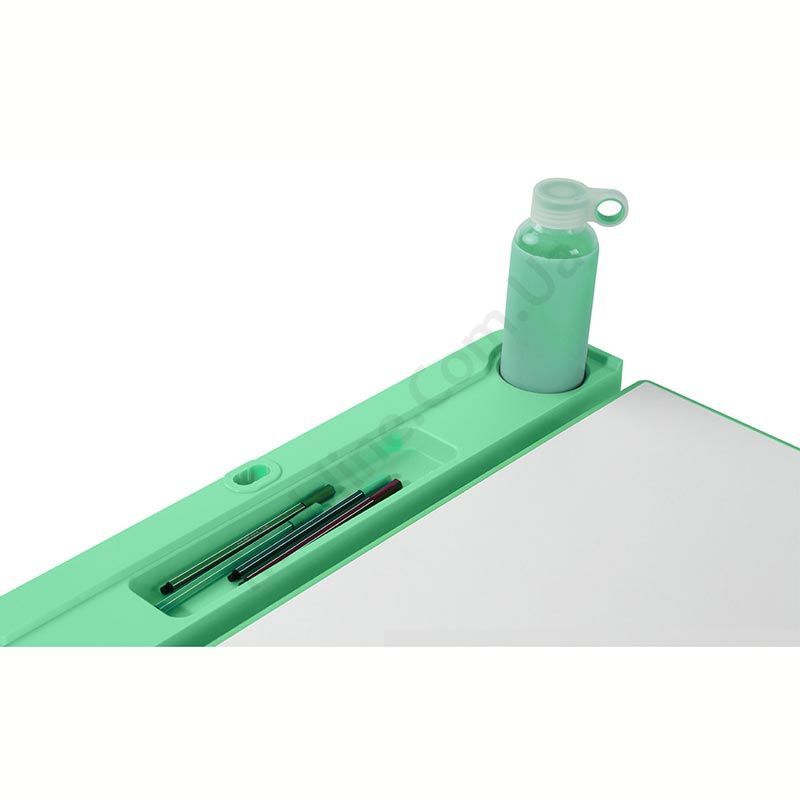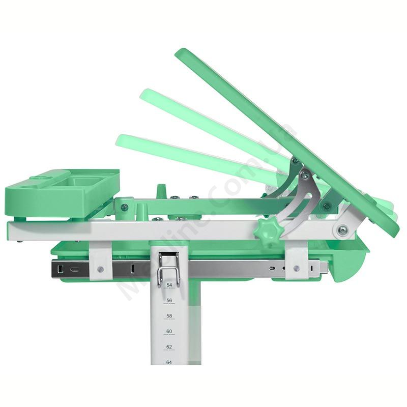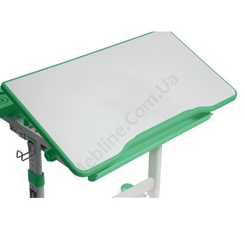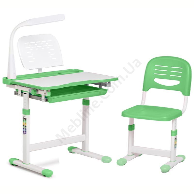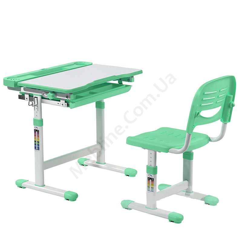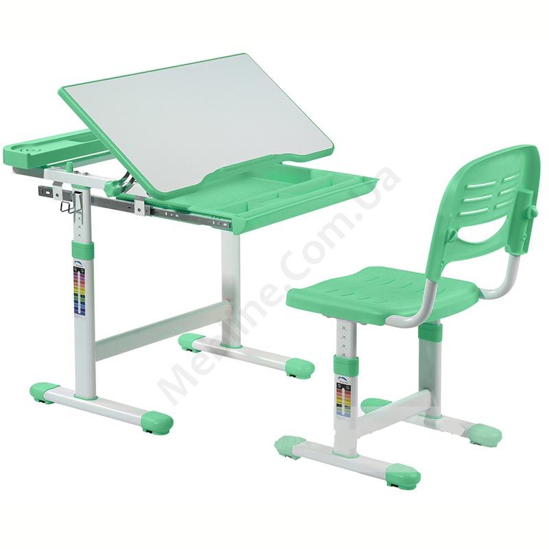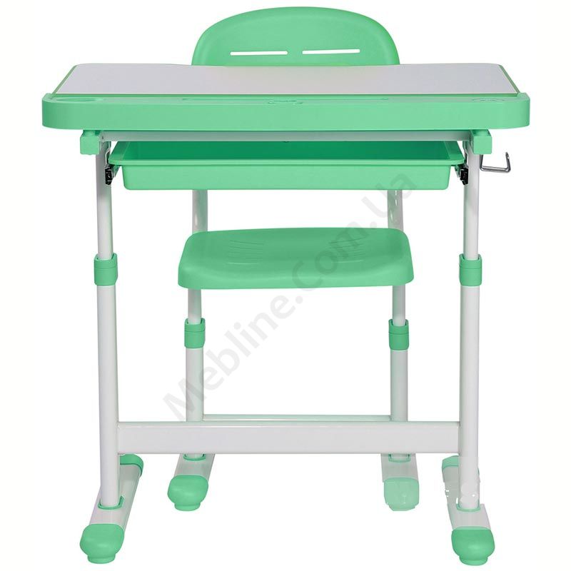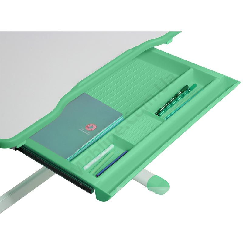 Зростаюча парта зі стільчиком зеленого кольору з шухлядою для зберігання та регулюванням нахилу стільниці.