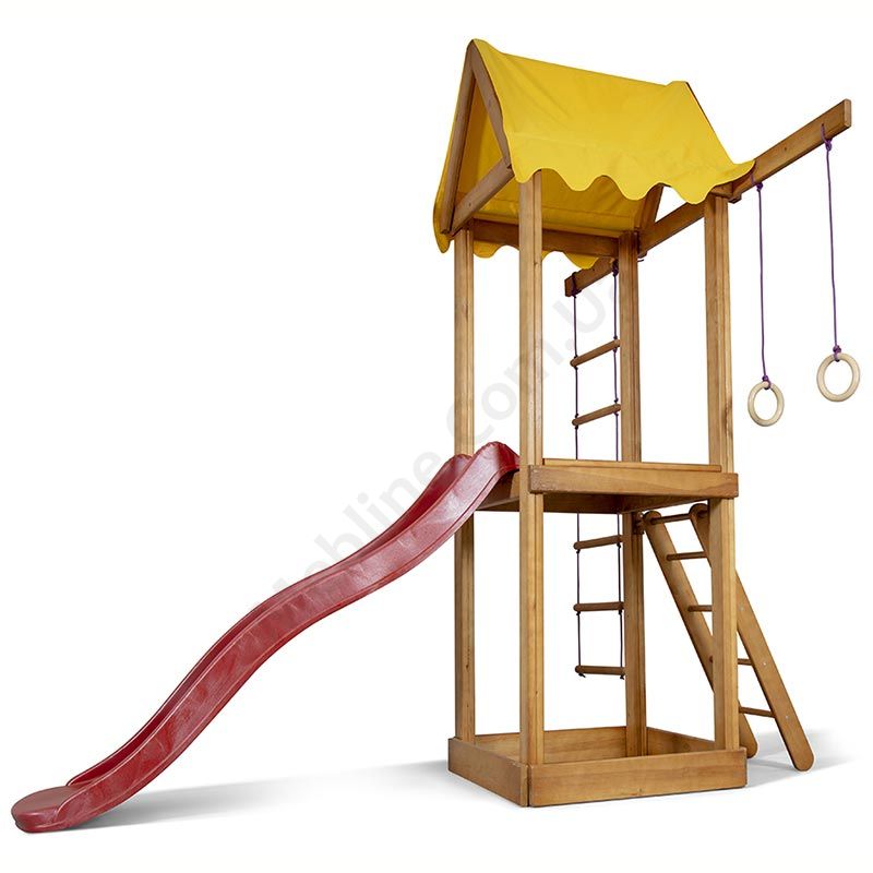 Дитячий ігровий комплекс для вулиці з гіркою, кільцями та мотузяними сходами.
