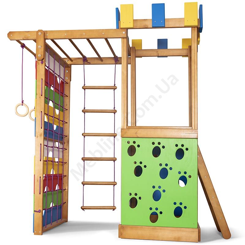 Дитячий ігровий комплекс для вулиці з гіркою, сіткою та кільцями.