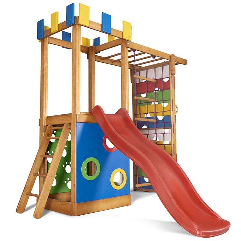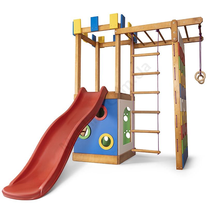 Дитячий ігровий комплекс для вулиці з гіркою, сіткою та мотузяними сходами.