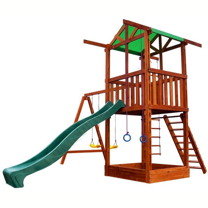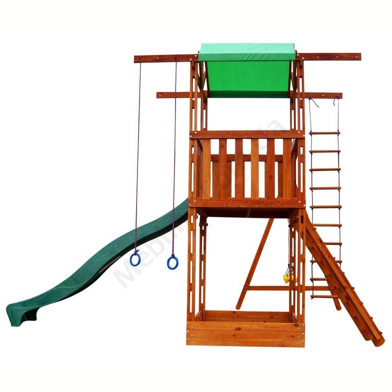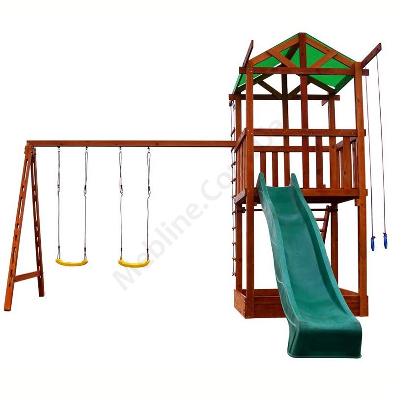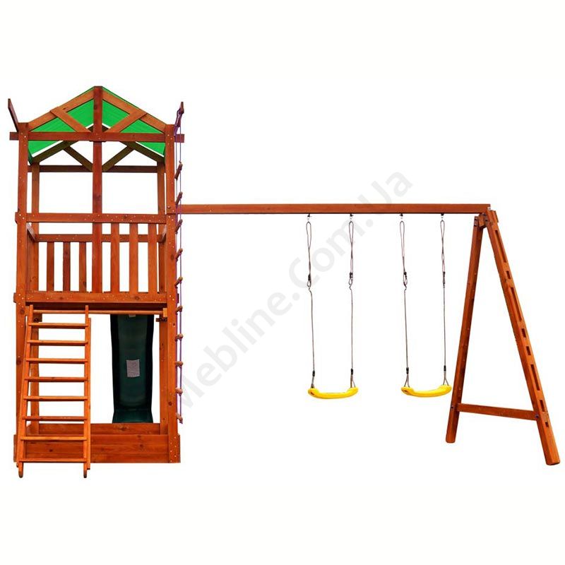 Дитячий ігровий комплекс для вулиці з гіркою, гойдалками та мотузяними сходами.