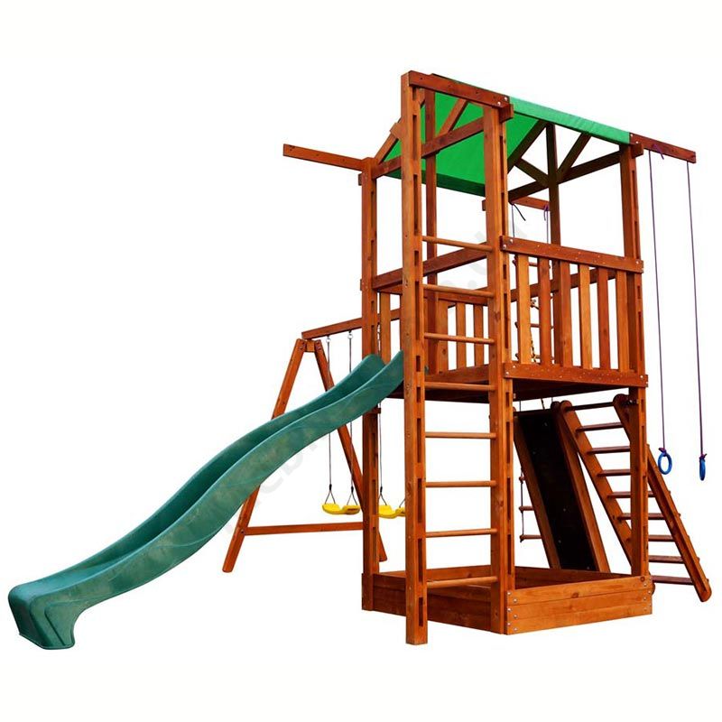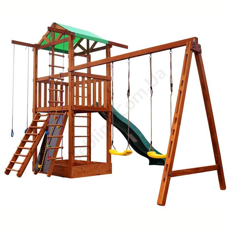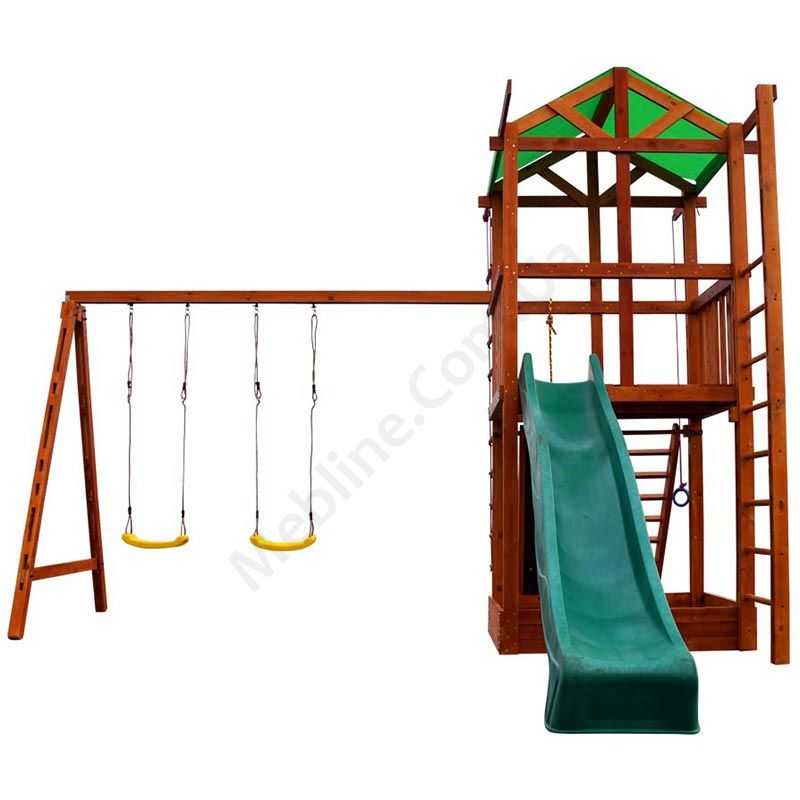 Дитячий ігровий комплекс для вулиці з гіркою, гойдалками та мотузяними сходами.