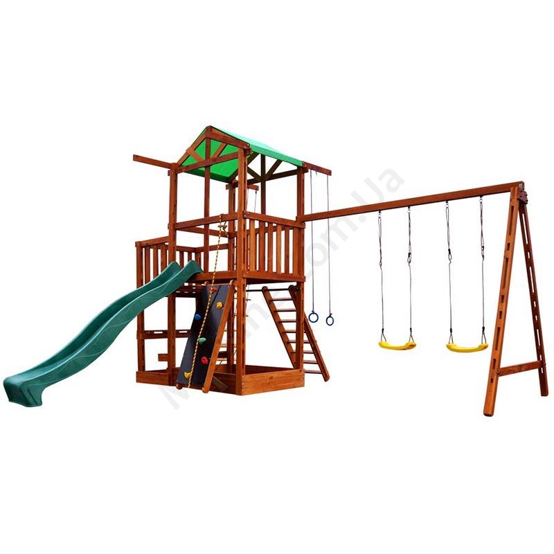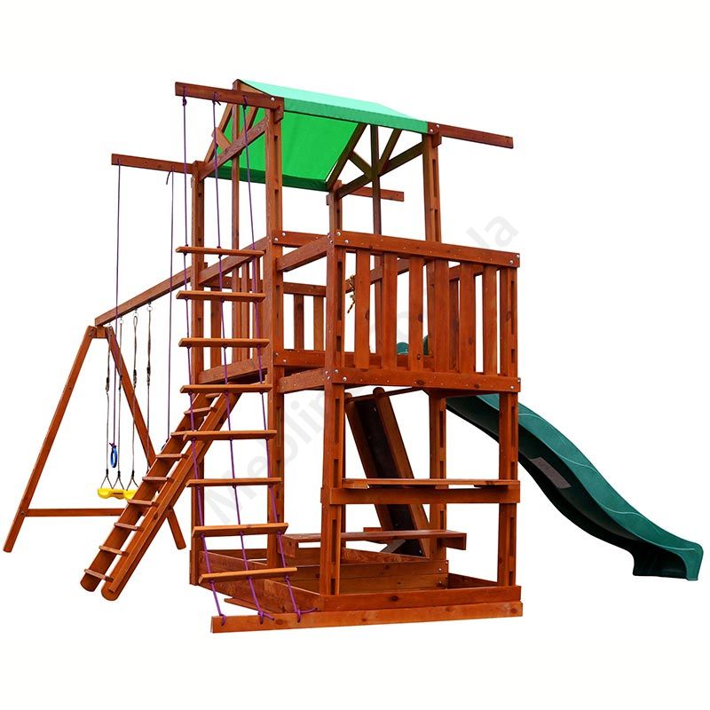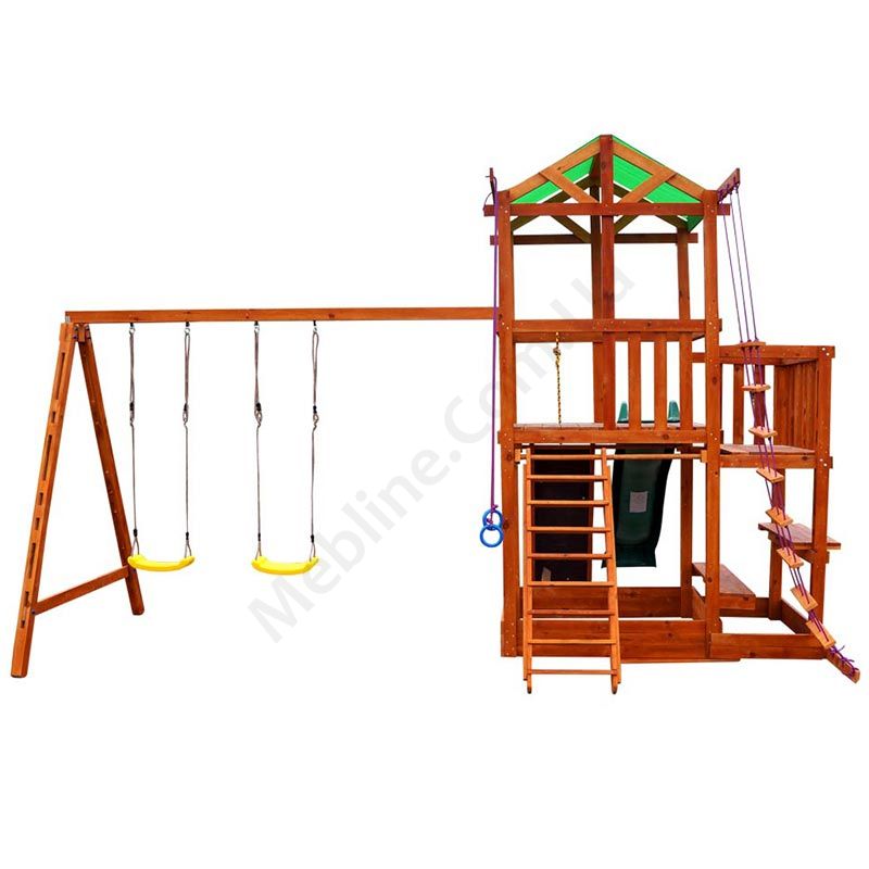 Дитячий ігровий комплекс для вулиці з гіркою, гойдалками та мотузяними сходами.