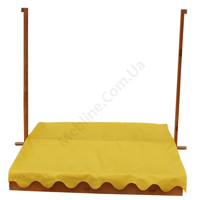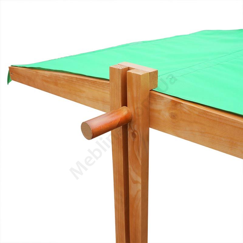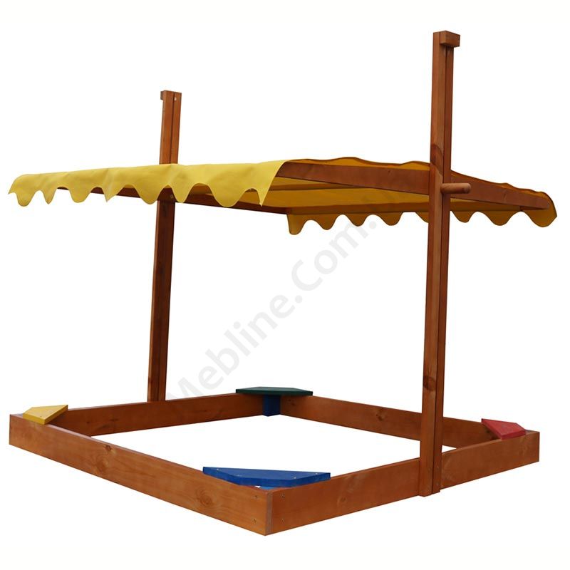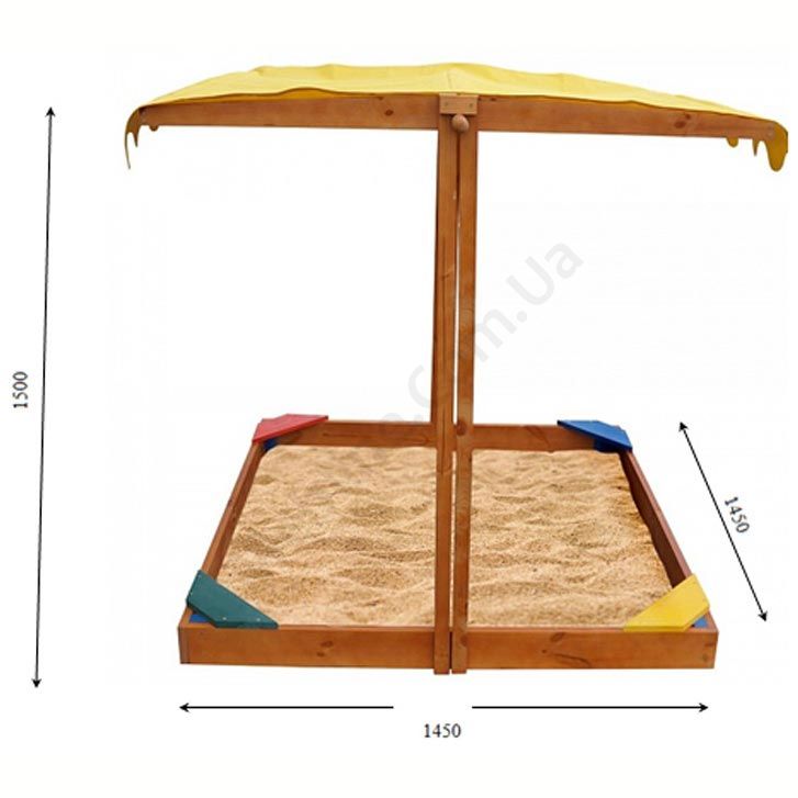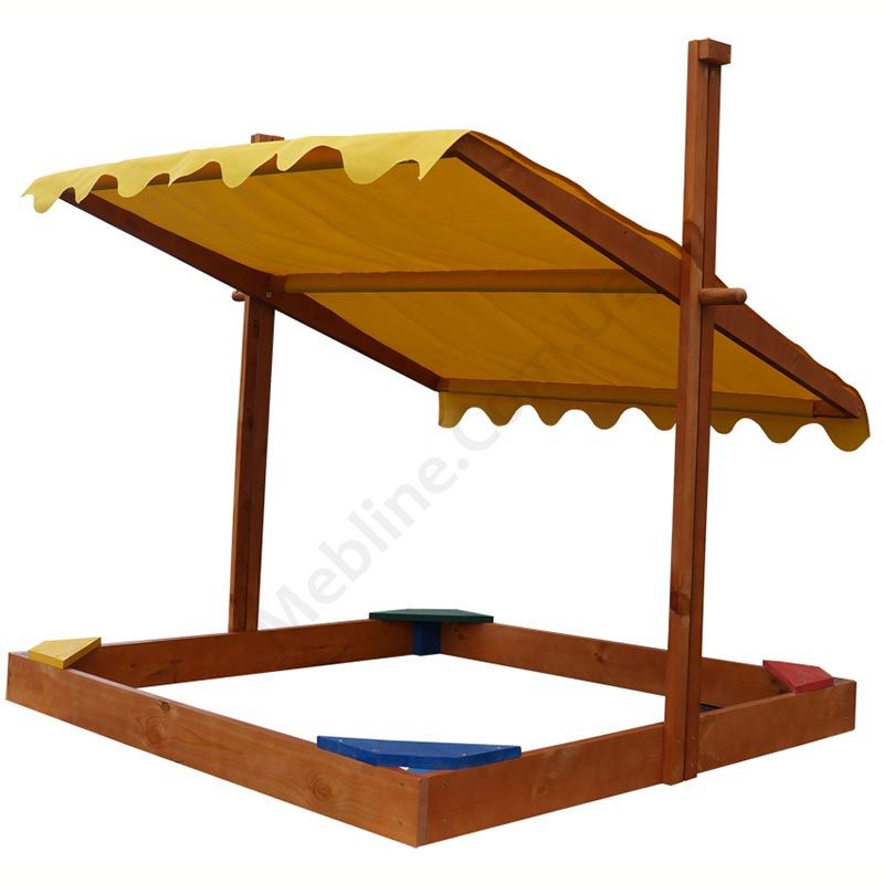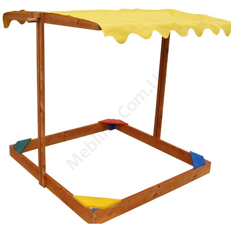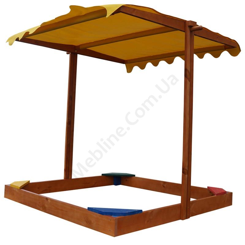 Дерев’яна дитяча пісочниця квадратної форми з навісом.