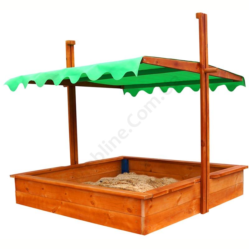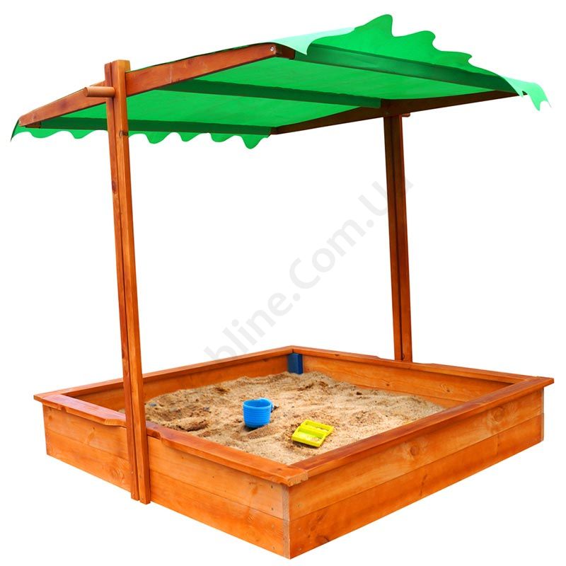 Дерев’яна дитяча пісочниця з навісом.
