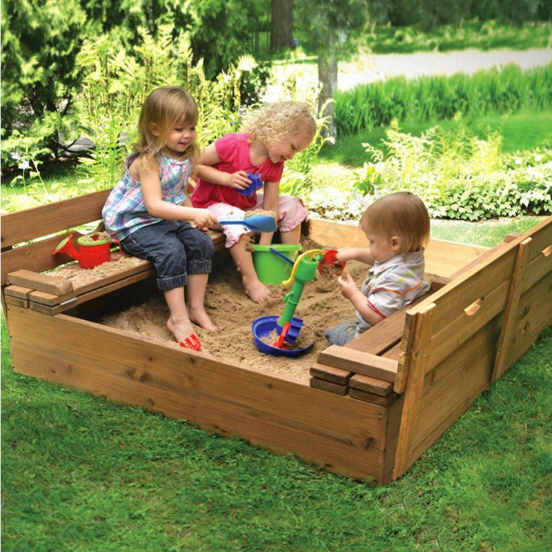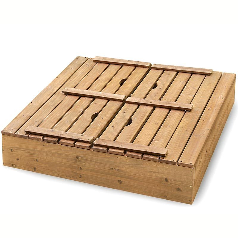 Дерев’яна дитяча пісочниця квадратної форми з кришкою.