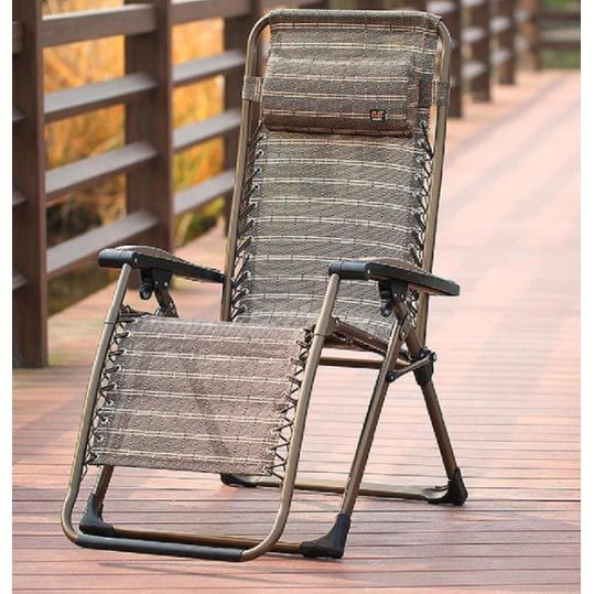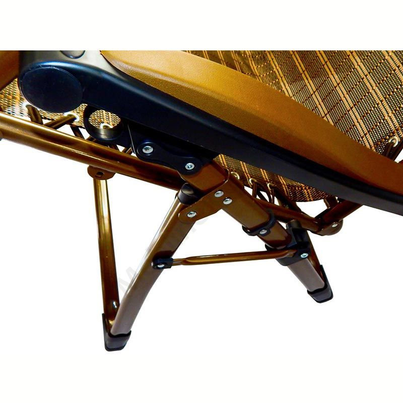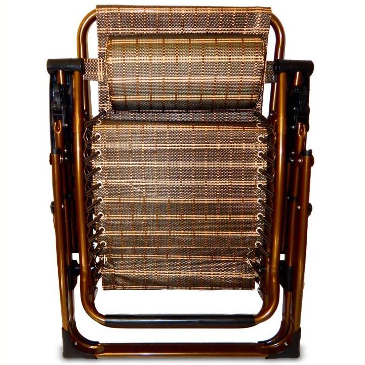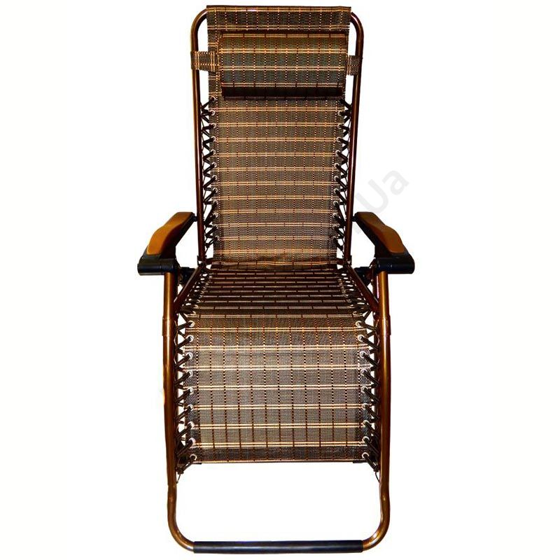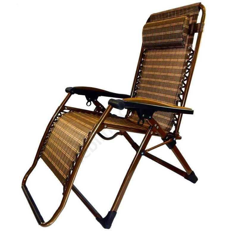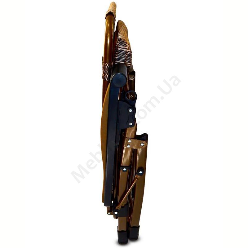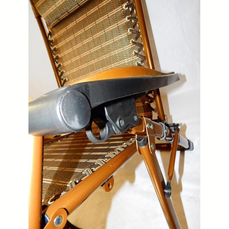 Складаний шезлонг з підлокітниками на металевому каркасі.