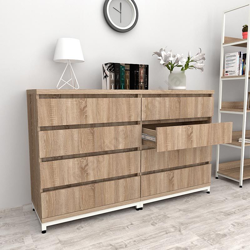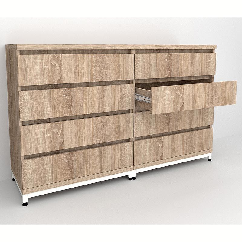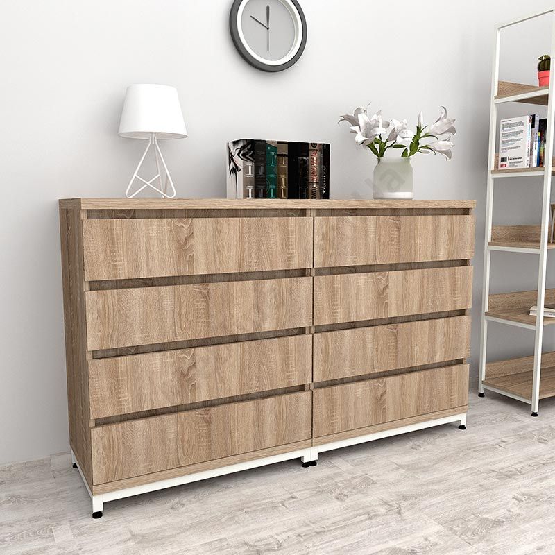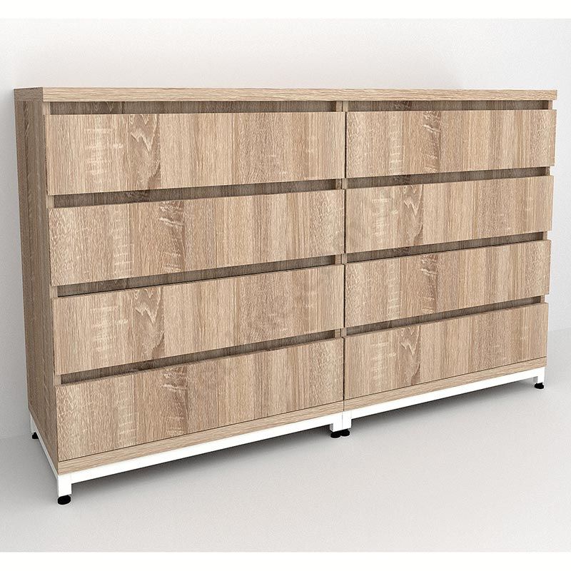 Виконаний з ламінованої ДСП Swiss Krono, завтовшки 32 мм.ДСП має високу щільність, екологічна безпека класу Е1.Протиударна кромка ПВХ, завтовшки 2 мм.Корпус — металева труба 25х25 мм, товщина стінок 1, 5 мм.Вісім висувних шухляд.Шухляди на телескопічних напрямних (400 мм) DC.Металеві ніжки.Підійде для приміщень у стилі лофт.