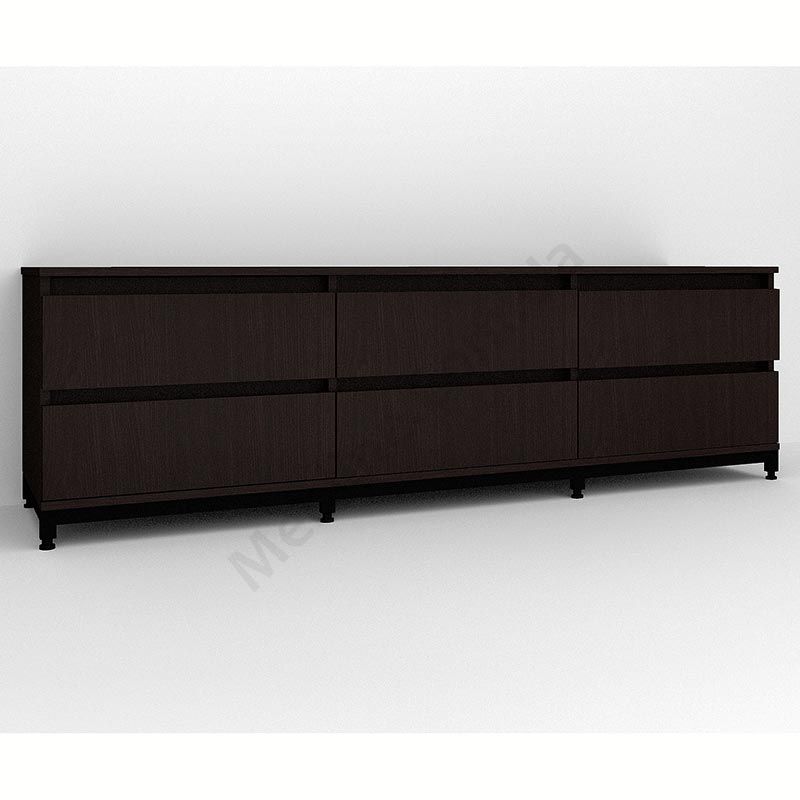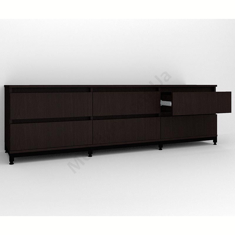 Виконаний з ламінованої ДСП Swiss Krono, завтовшки 16 мм.ДСП має високу щільність, екологічна безпека класу Е1.Протиударна кромка ПВХ, завтовшки 0, 5 мм.Корпус — металева труба 25х25 мм, товщина стінок 1, 5 мм.Шість висувних шухляд.Шухляди на телескопічних напрямних (400 мм) DC.Металеві ніжки.Підійде для приміщень у стилі лофт.