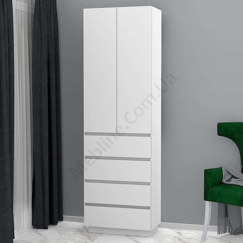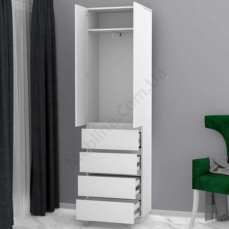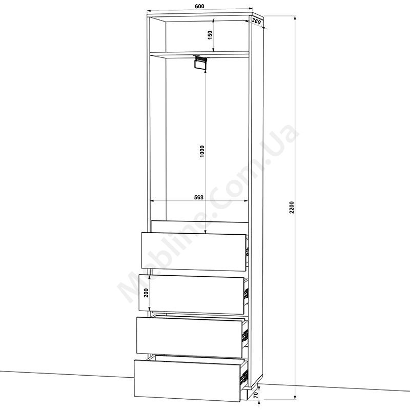Матеріал — ламінована ДСП Swiss Krono, завтовшки 16 мм.Екологічна безпека класу Е-1.ДСП має високу щільність.Фурнітура — DC та Linken.Протиударна кромка — ПВХ, завтовшки 1 мм.Регульовані опори 70 мм.Дві розпашні двері.За дверцятами мікроліфт для одягу та верхня полиця.Знизу чотири висувні шухляди.