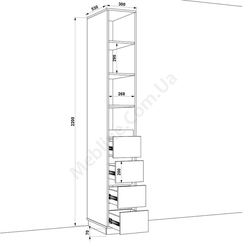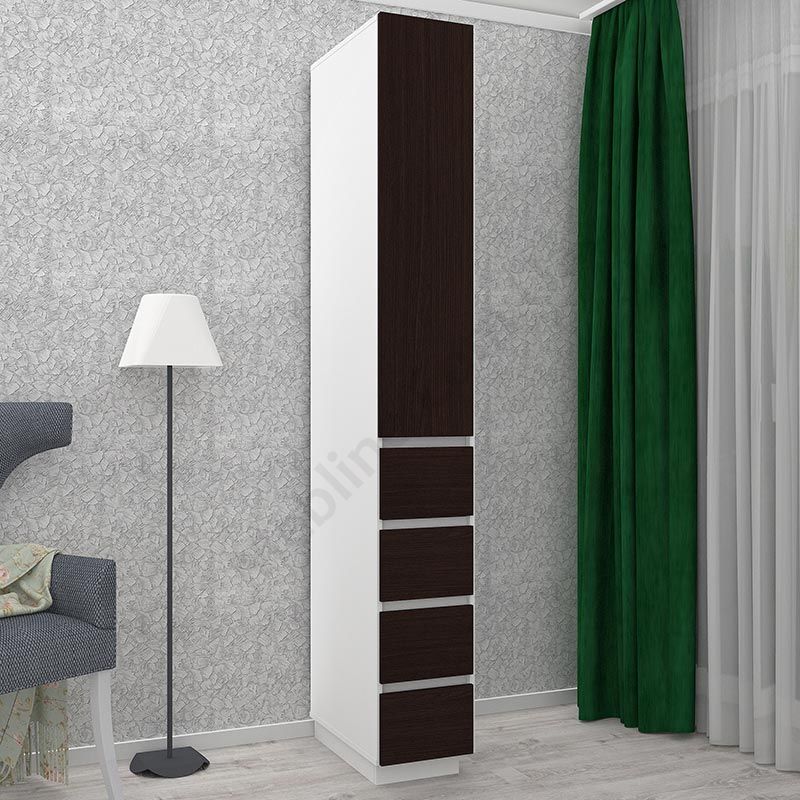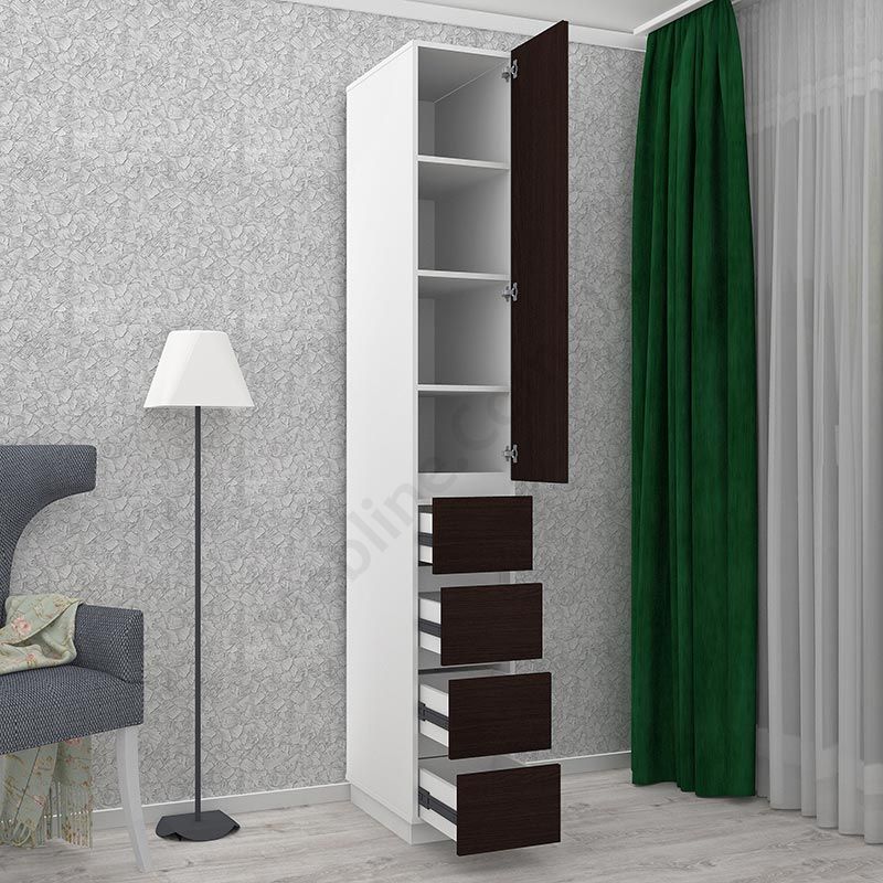 Матеріал — ламінована ДСП Swiss Krono, завтовшки 16 мм.Екологічна безпека класу Е-1.ДСП має високу щільність.Фурнітура — DC та Linken.Протиударна кромка — ПВХ, завтовшки 1 мм.Регульовані опори 70 мм.Одні розпашні дверцята.За дверцятами чотири полиці.Знизу чотири висувні шухляди.