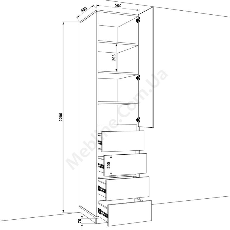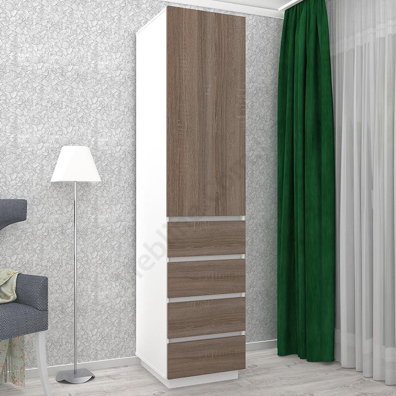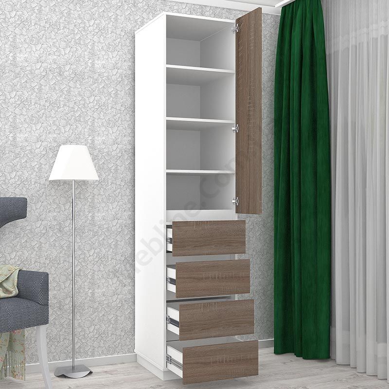 Матеріал — ламінована ДСП Swiss Krono, завтовшки 16 мм.Екологічна безпека класу Е-1.ДСП має високу щільність.Фурнітура — DC та Linken.Протиударна кромка — ПВХ, завтовшки 1 мм.Регульовані опори 70 мм.Одні розпашні дверцята.За дверцятами чотири полиці.Знизу чотири висувні шухляди.