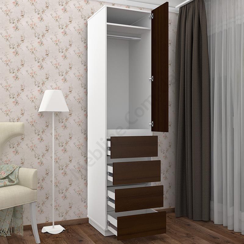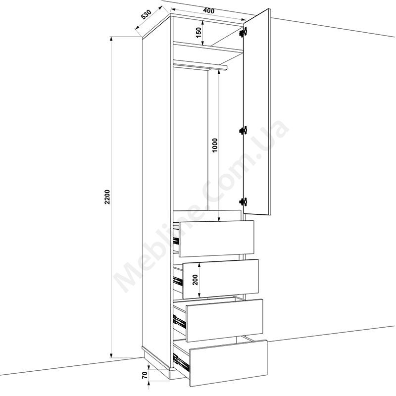 Матеріал — ламінована ДСП Swiss Krono, завтовшки 16 мм.Екологічна безпека класу Е-1.ДСП має високу щільність.Фурнітура — DC та Linken.Протиударна кромка — ПВХ, завтовшки 1 мм.Регульовані опори 70 мм.Одні розпашні дверцята.За дверцятами штанга для одягу та верхня полиця.Знизу чотири висувні шухляди.