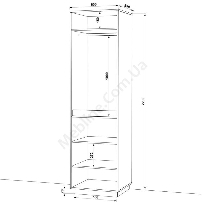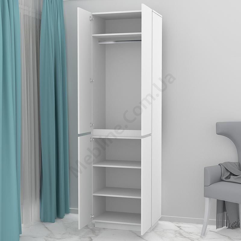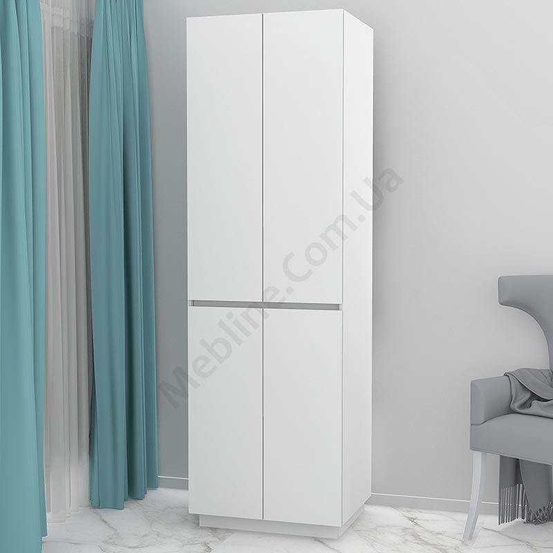 Матеріал — ламінована ДСП Swiss Krono, завтовшки 16 мм.Екологічна безпека класу Е-1.ДСП має високу щільність.Фурнітура — DC та Linken.Протиударна кромка — ПВХ, завтовшки 1 мм.Регульовані опори 70 мм.Чотири розпашні двері.За верхніми дверцятами штанга для одягу та верхня полиця.За нижніми дверцятами три полиці.