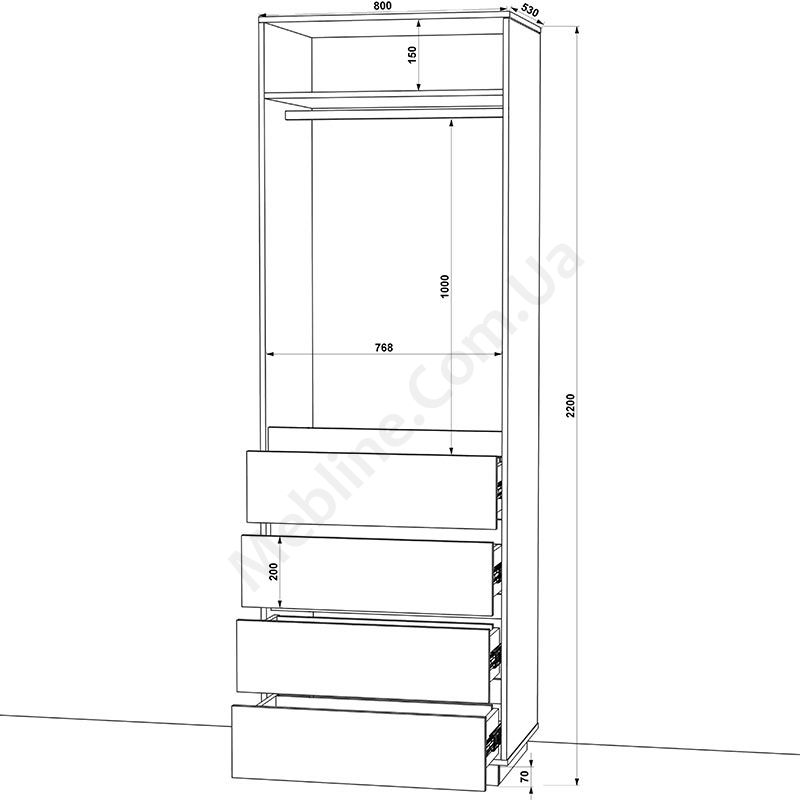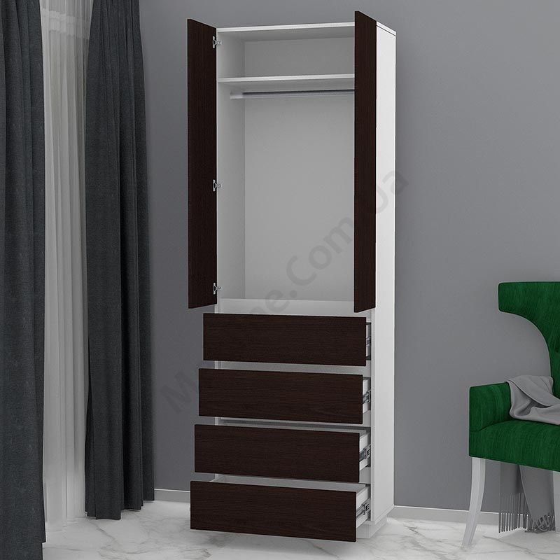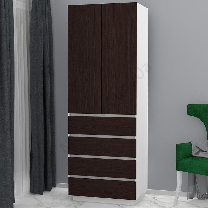 Матеріал — ламінована ДСП Swiss Krono, завтовшки 16 мм.Екологічна безпека класу Е-1.ДСП має високу щільність.Фурнітура — DC та Linken.Протиударна кромка — ПВХ, завтовшки 1 мм.Регульовані опори 70 мм.Дві розпашні двері.За дверцятами штанга для одягу та верхня полиця.Знизу чотири висувні шухляди.