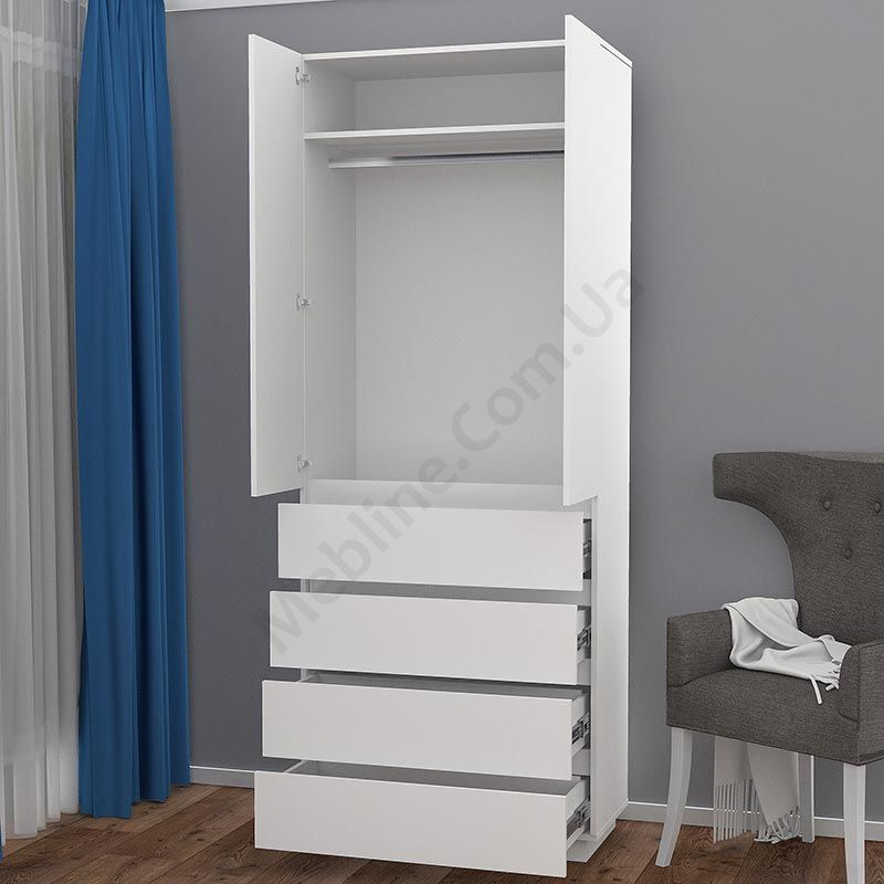 Двостулкова шафа зі штангою для одягу та шухлядами.