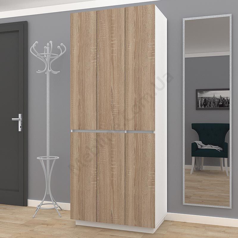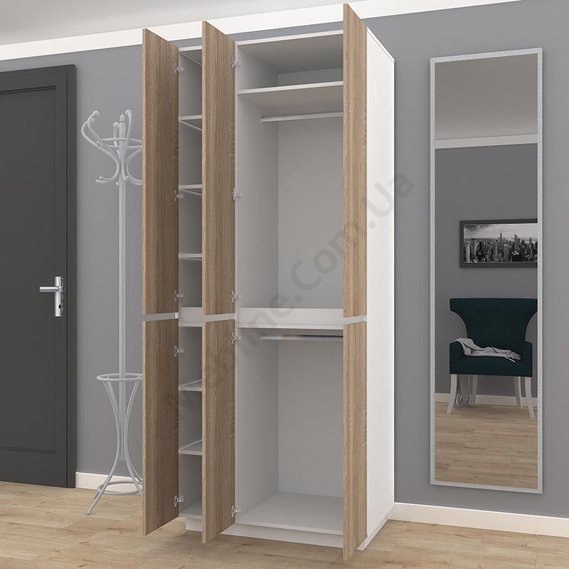Матеріал — ламінована ДСП Swiss Krono, завтовшки 16 мм.Екологічна безпека класу Е-1.ДСП має високу щільність.Фурнітура — DC та Linken.Протиударна кромка — ПВХ, завтовшки 1 мм.Регульовані опори 70 мм.Шість розпашних дверцят.За верхніми лівими дверцятами чотири полиці, за нижніми лівими — три.За верхніми правими дверцятами штанга для одягу з верхньою полицею, за нижніми — штанга для одягу.