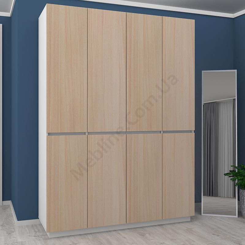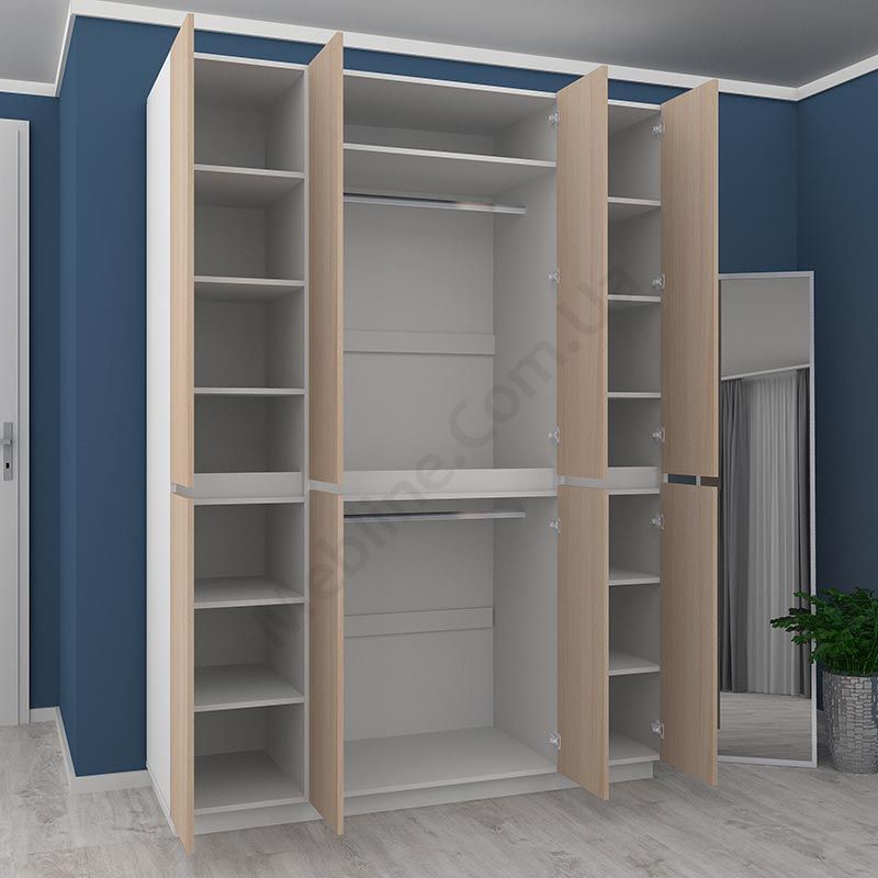 Матеріал — ламінована ДСП Swiss Krono, завтовшки 16 мм.Екологічна безпека класу Е-1.ДСП має високу щільність.Фурнітура — DC та Linken.Протиударна кромка — ПВХ, завтовшки 1 мм.Регульовані опори 70 мм.Вісім розпашних дверцят.За верхніми крайніми дверцятами по чотири полиці, за нижніми крайніми — по три.За верхніми середніми дверцятами штанга для одягу з верхньою полицею, за нижніми — штанга для одягу.