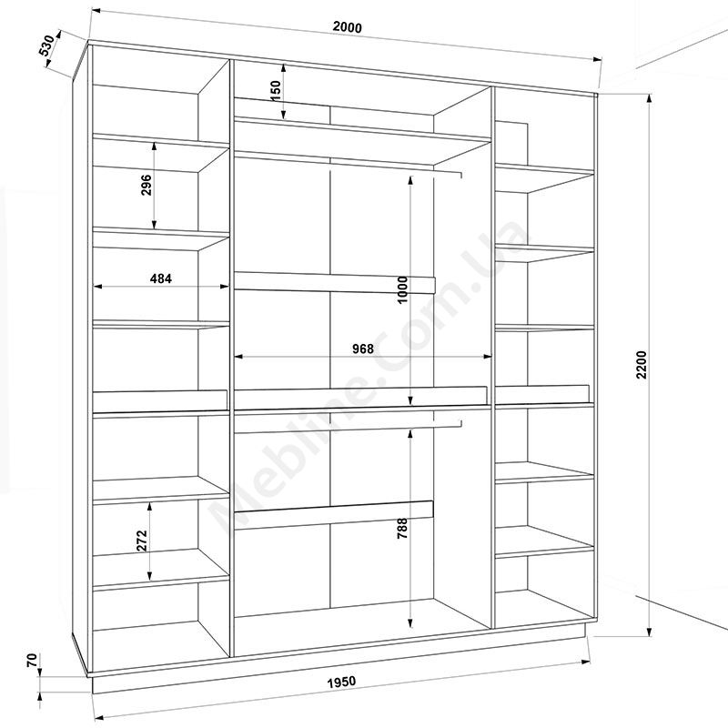 Матеріал — ламінована ДСП Swiss Krono, завтовшки 16 мм.Екологічна безпека класу Е-1.ДСП має високу щільність.Фурнітура — DC та Linken.Протиударна кромка — ПВХ, завтовшки 1 мм.Регульовані опори 70 мм.Вісім розпашних дверцят.За верхніми крайніми дверцятами по чотири полиці, за нижніми крайніми — по три.За верхніми середніми дверцятами штанга для одягу з верхньою полицею, за нижніми — штанга для одягу.