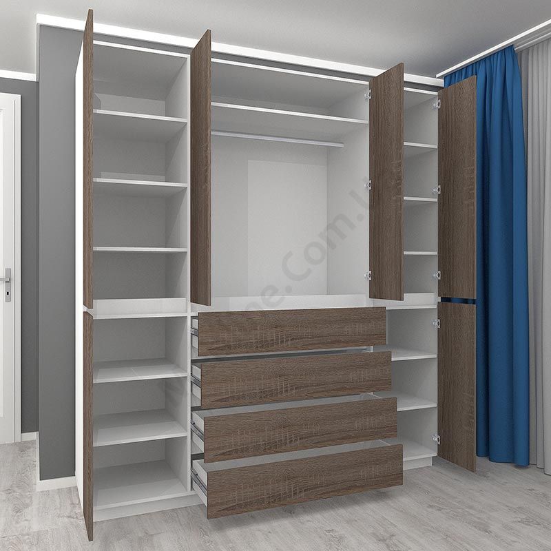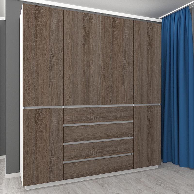 Чотирьохстулкова шафа з полицями, штангою для одягу та шухлядами.