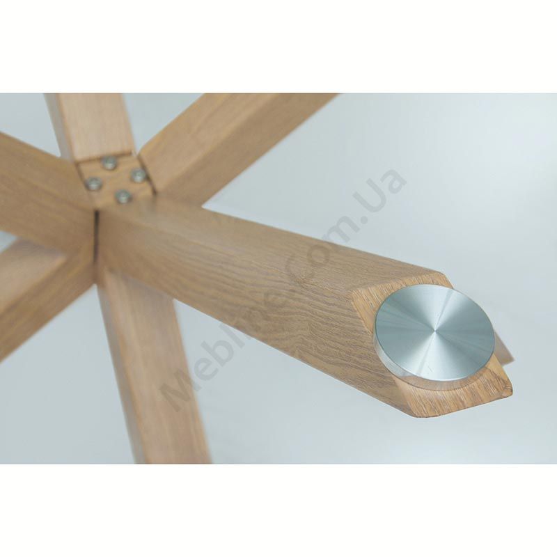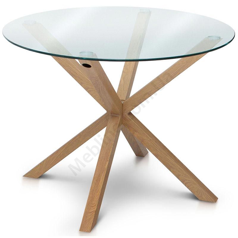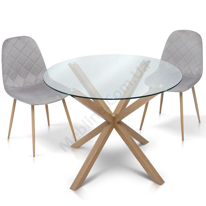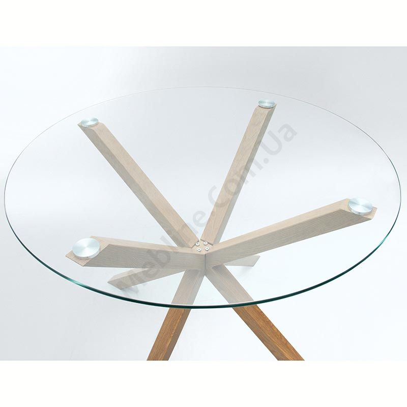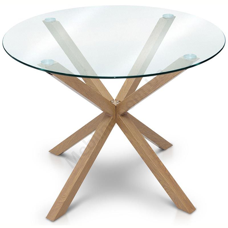 Обідній стіл із круглою скляною стільницею на металевих ніжках.