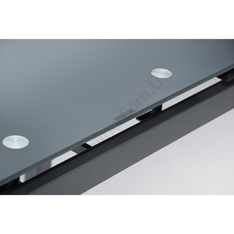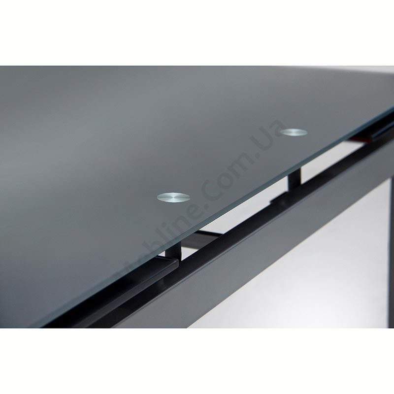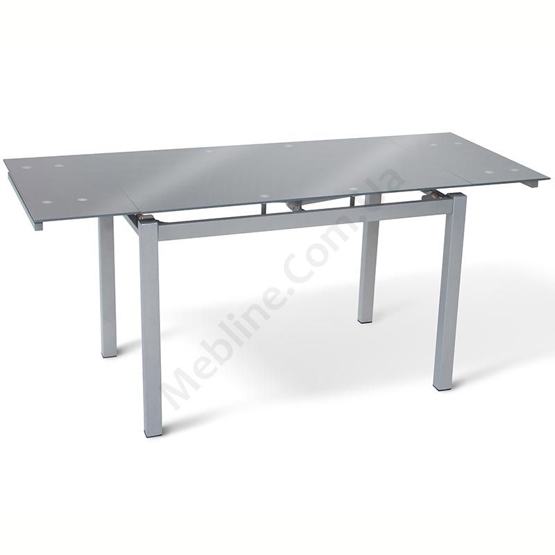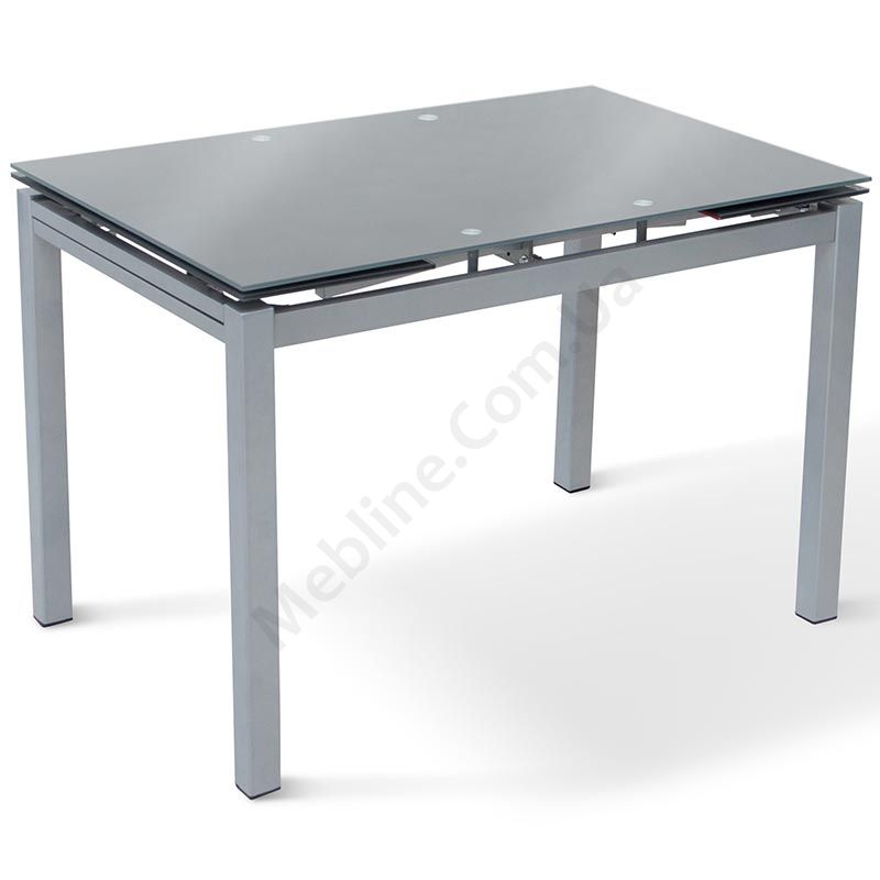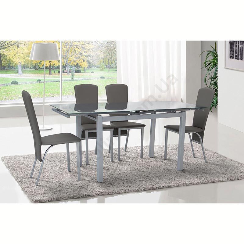 Розкладний обідній стіл зі скляною стільницею на металевих ніжках.
