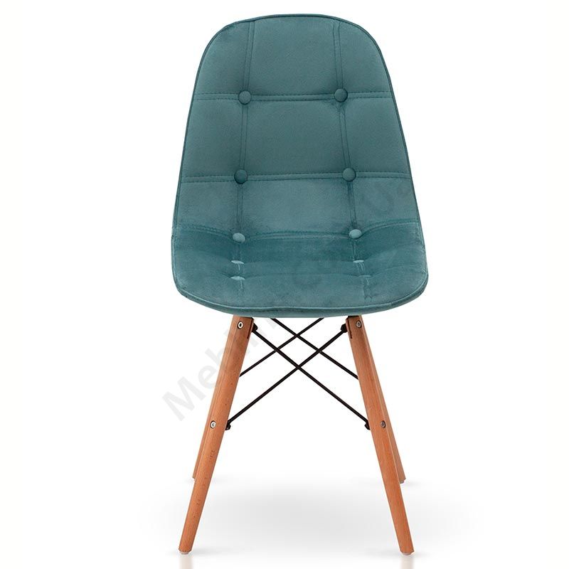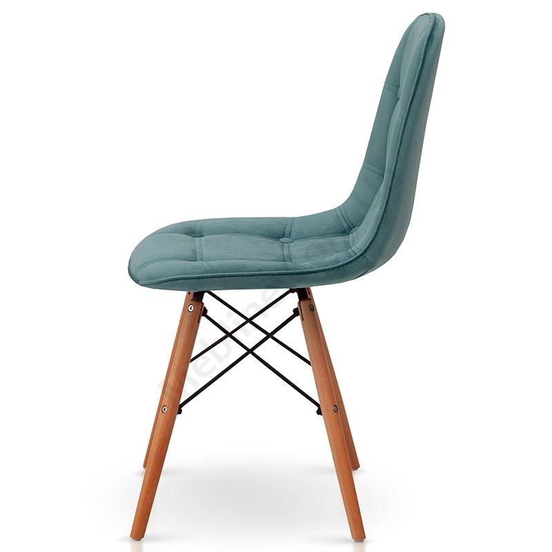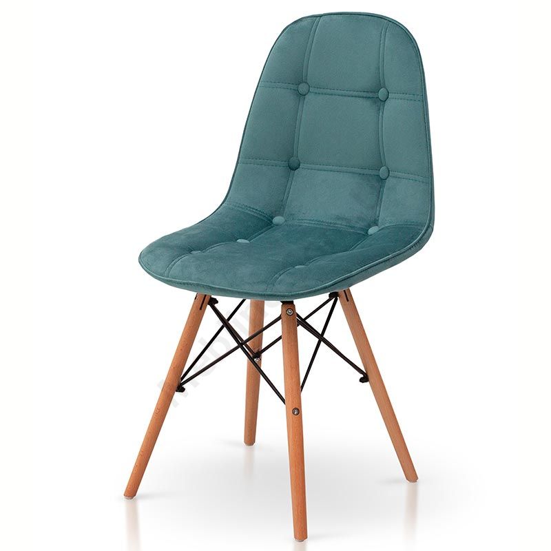 М’який стілець на дерев’яних ніжках з оббивкою аквамаринового кольору.
