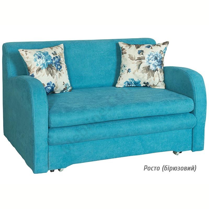 Розкладний диван з м’якими підлокітниками та невеликими подушками.