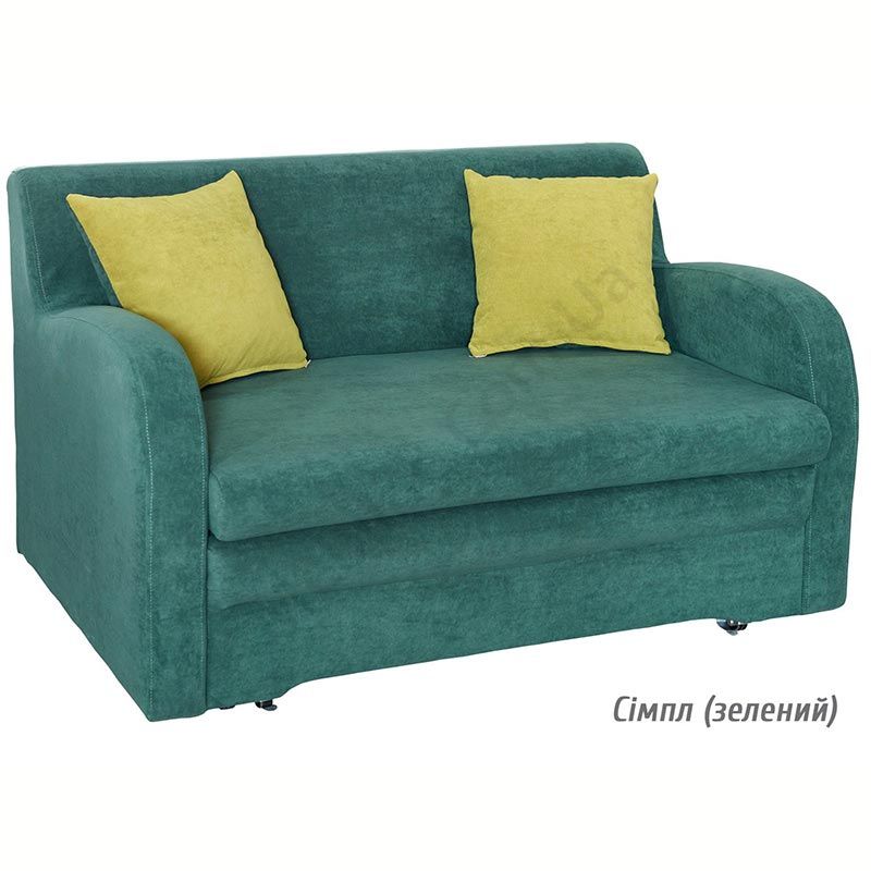 Розкладний диван з м’якими підлокітниками та невеликими подушками.