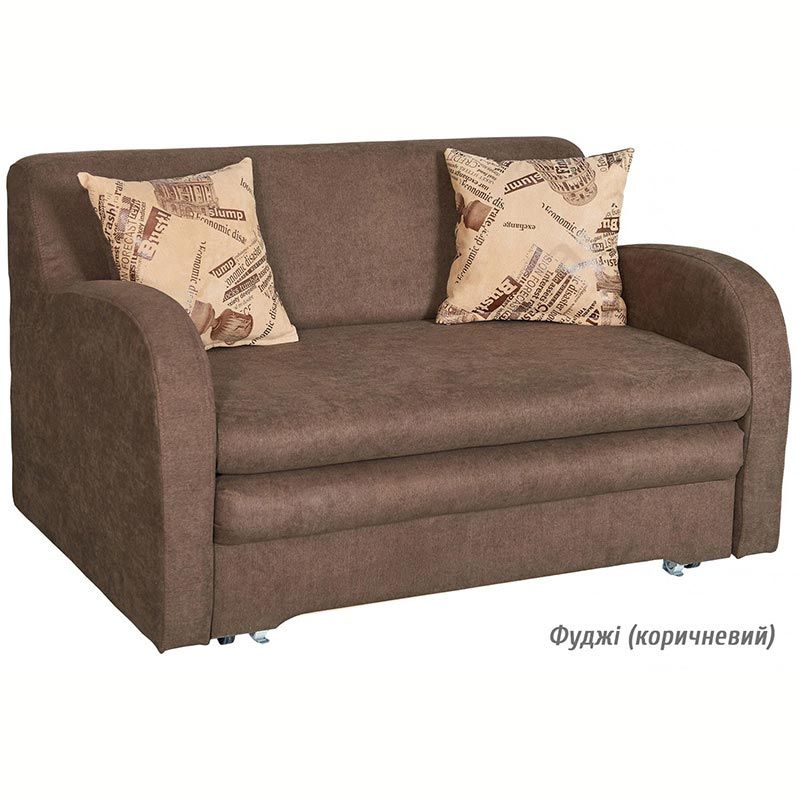 Розкладний диван з м’якими підлокітниками та невеликими подушками.