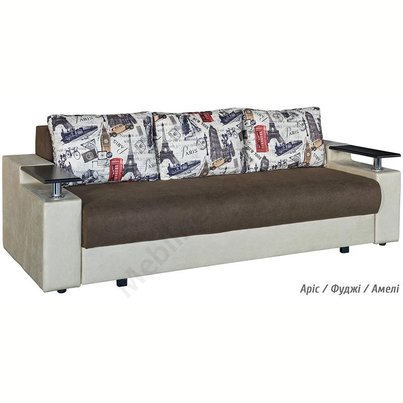 Розкладний диван з твердими підлокітниками та м’якими подушками.