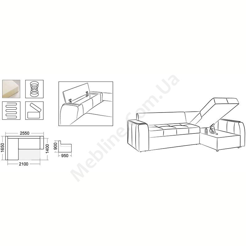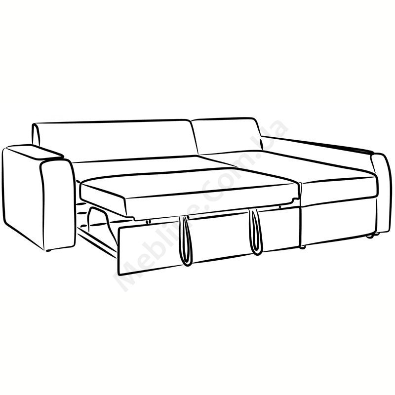 Розкладний кутовий диван з твердими підлокітниками та коробом для білизни.