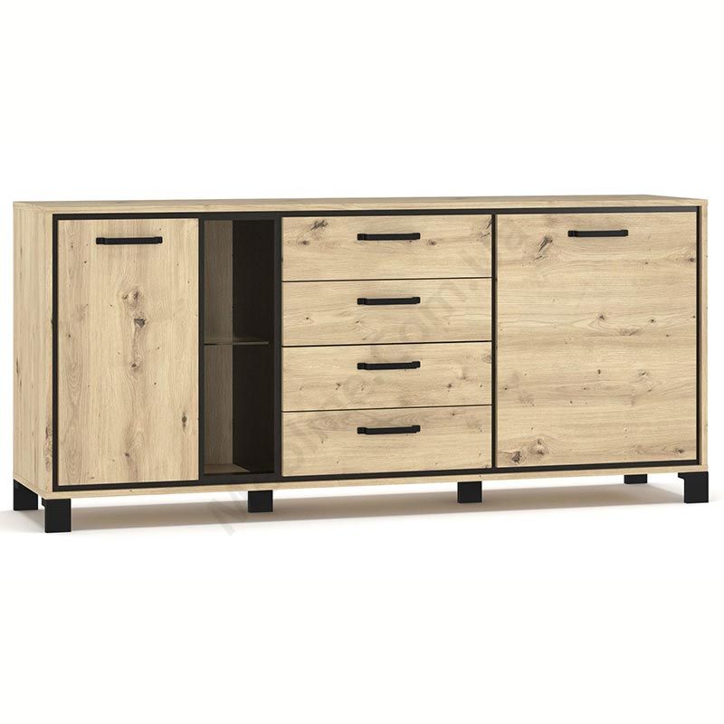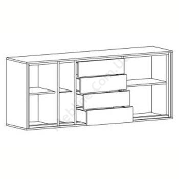 Комод з дверцятами, шухлядами та відкритими полицями.