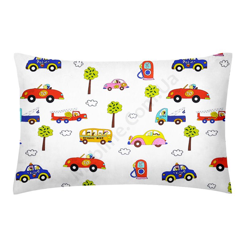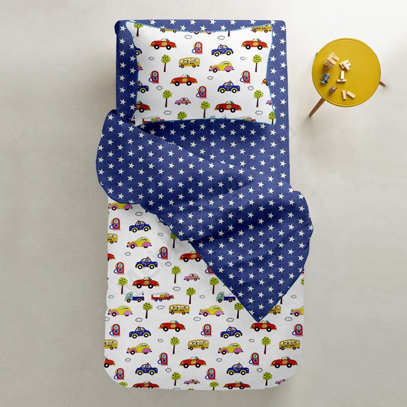 На підковдрі та наволочці зображені машинки.Матеріал — бязь (100% бавовна), щільністю 135 ниток/см2:- без домішок синтетики.