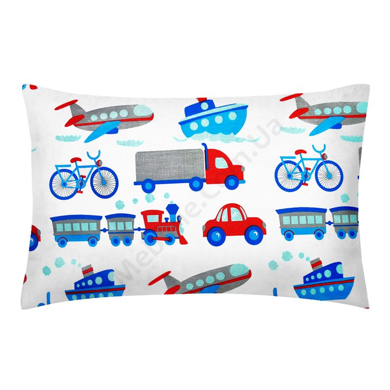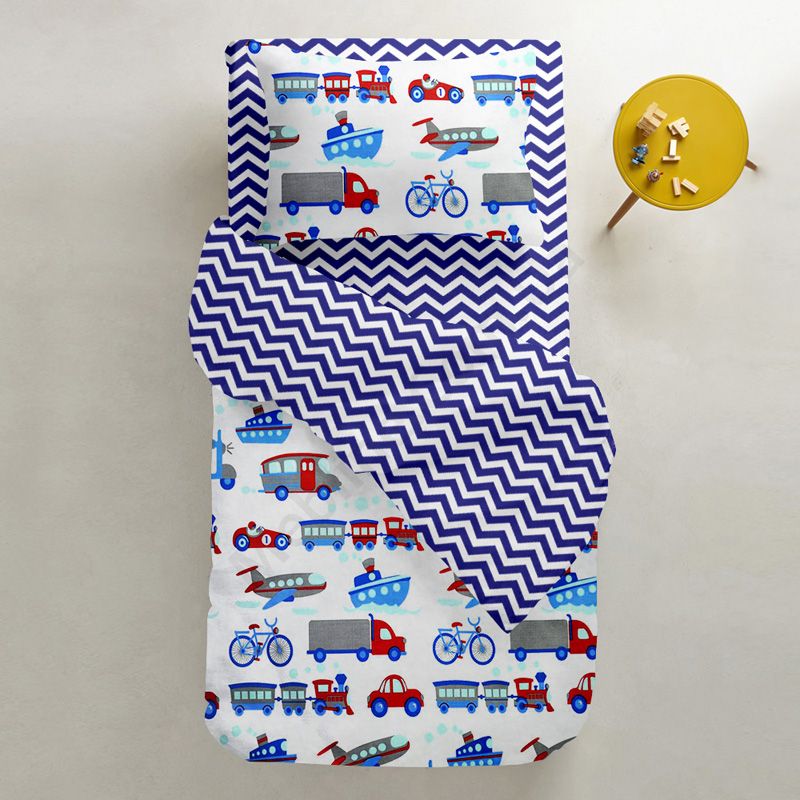 На підковдрі та наволочці зображені машинки.Матеріал — бязь (100% бавовна), щільністю 135 ниток/см2:- без домішок синтетики.