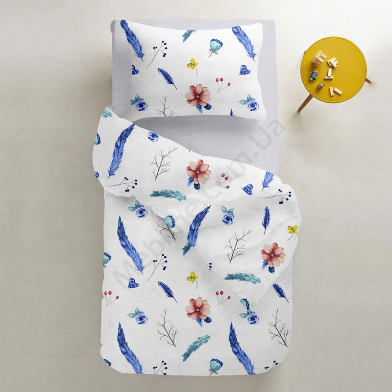 На підковдрі та наволочці зображені пір’їни.Матеріал бязь (100% бавовна), щільністю 135 ниток/см2:- без домішок синтетики.