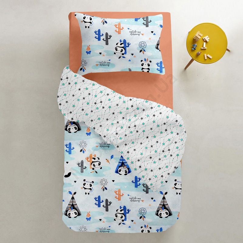 На підковдрі та наволочці зображення панда-индеец.Матеріал бязь (100% бавовна), щільністю 135 ниток/см2:- без домішок синтетики.