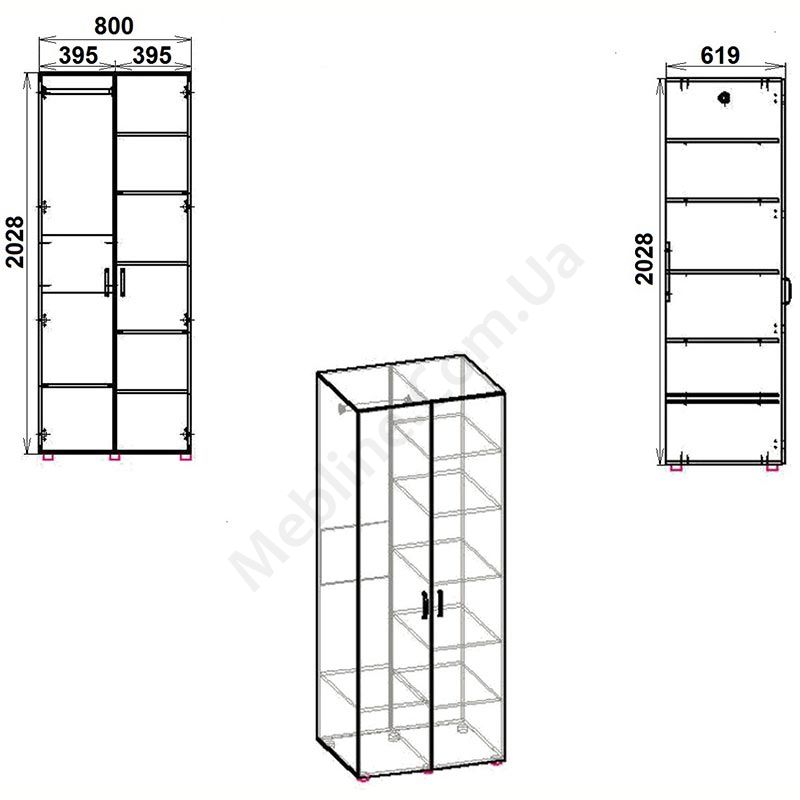Дводверна шафа зі штангою для одягу та полицями.