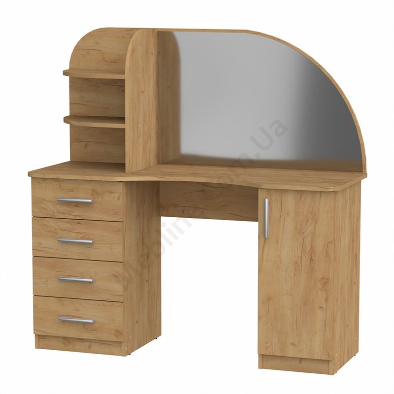 Туалетний столик із дзеркалом, тумбами та відкритими полицями.