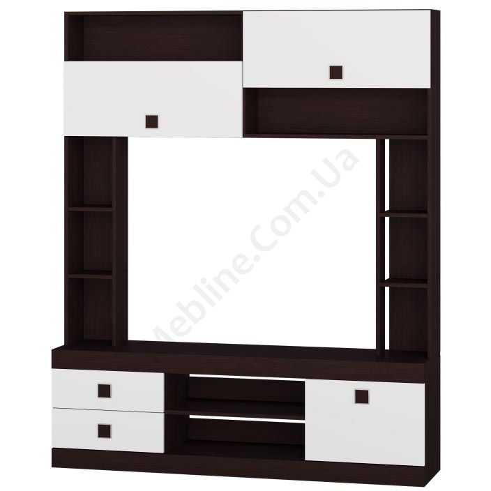 Стінка у вітальню з тумбою під телевізор, висувними шухлядами та надставкою.