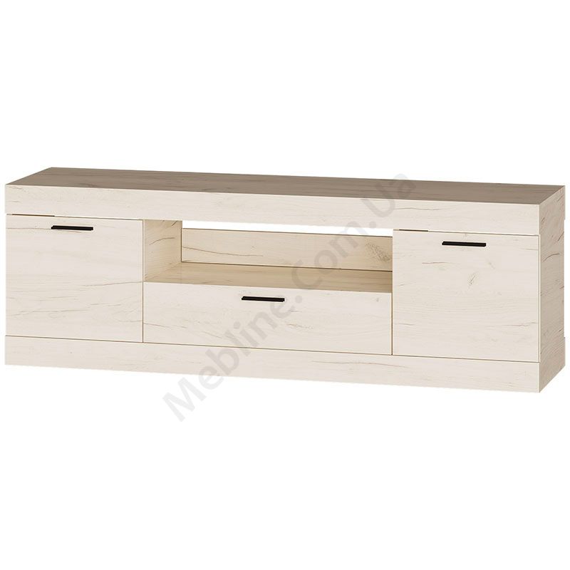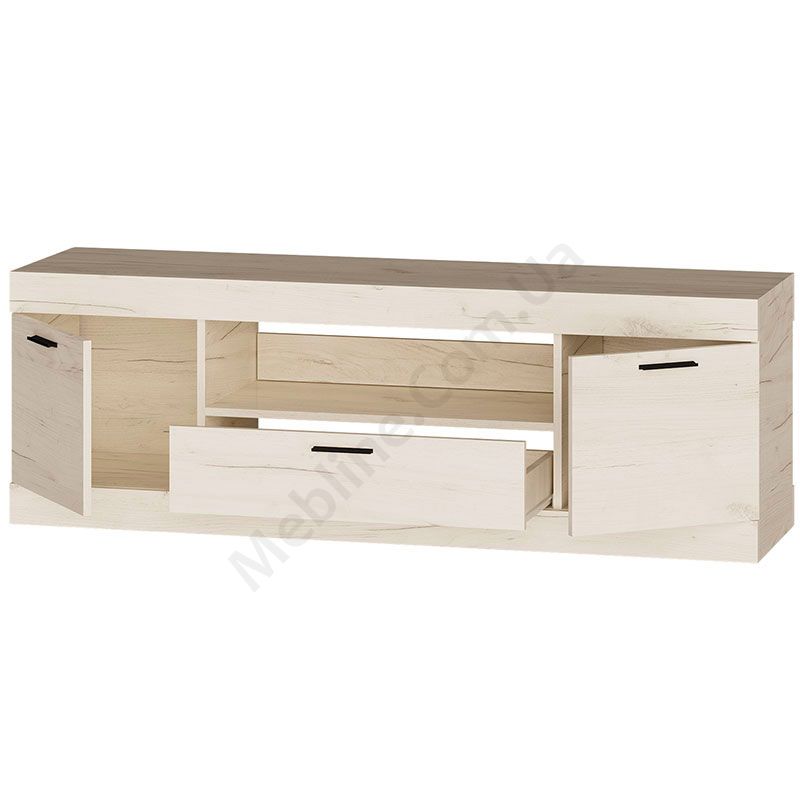 Тумба під телевізор з висувними шухлядами, дверцятами та полицею.