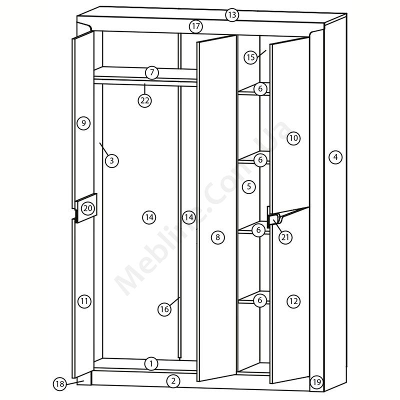 - За лівими та середніми дверцятами штанга для одягу та верхня поличка